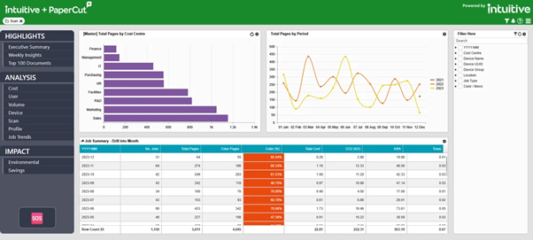 - Caso d’uso nell’istruzione superiore: le dashboard di Intuitive hanno fornito all’istituto una visione chiara delle attività di stampa, consentendo un uso più intelligente dei dispositivi esistenti e un migliore controllo dei costi. Sorprendentemente, il cliente riteneva che non venissero effettuate scansioni, ma Intuitive ha rivelato oltre 30.000 scansioni all’anno. Questa informazione ha portato a ulteriori giorni di consulenza per capire cosa venisse scansionato e perché. Il risultato? Una chiara opportunità di upselling.